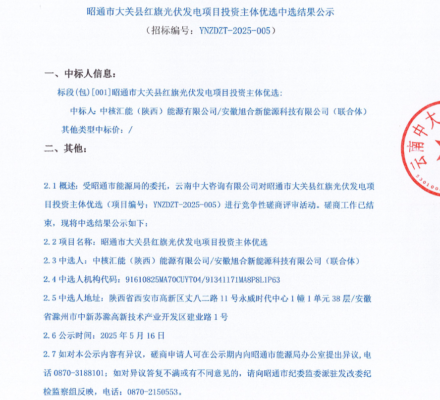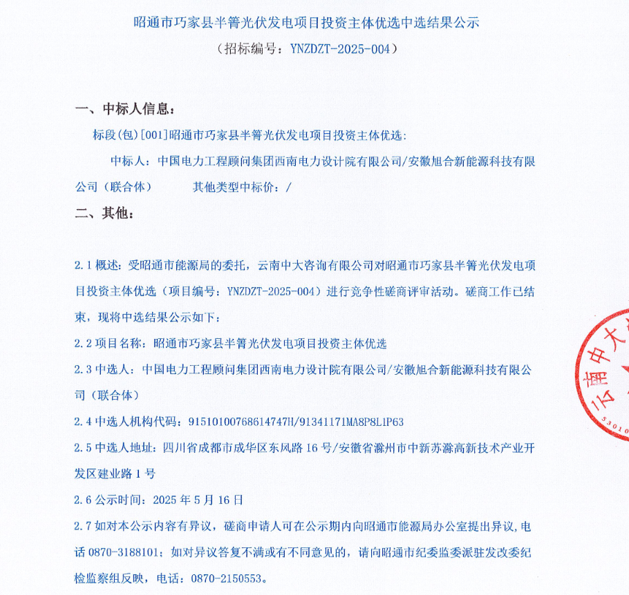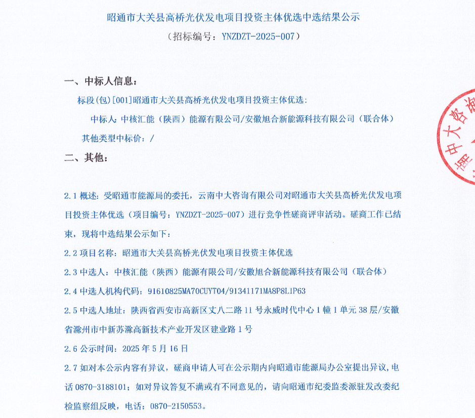5月15日,雲南省昭通市公布了5個、規模為51萬千瓦的光伏項目競配的中標情況(中標文件見附件),被中核、華能、中能建的下屬企業獲得。